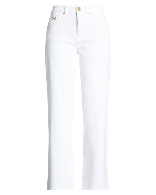 Straight-leg pants, woven, stretchy fabric, solid color with appliqués, brand logo, embellished, mid rise, regular fit, zipper fastening, five pockets, machine wash, do not bleach, tumble dry , Color: White , Size: 8