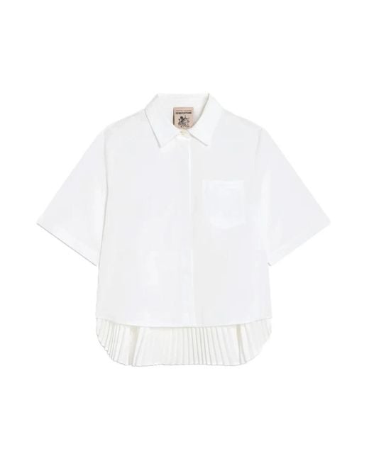 Semicouture Camicia Dominga blouse is a short-sleeve white shirt featuring a dramatic back slit with a pleated insert, designed to add a refined focal point to everyday outfits. Key attributes: White | Cocco | Cotton | Chest pocket | Button placket | Short sleeves | Collar | Full back slit with pleated insert | Longer back hem | Partially open back | Dimensions & fit: True to size | Full back slit with pleated lower panel | Back hem longer than front | Composition & care: 96% cotton, 4% elastane | Do not wash Color: white