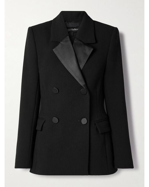 Women's Black Double-Breasted Silk-Satin Trimmed Wool-Blend Blazer
