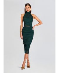 Go to FWRD90% Polyester, 10% Spandex. Hand wash. Hidden side zipper closure. Button loop closure at halterneck. Partially lined. Mesh material with draped slinky jersey overlay design. Ruching at sides. Color: green