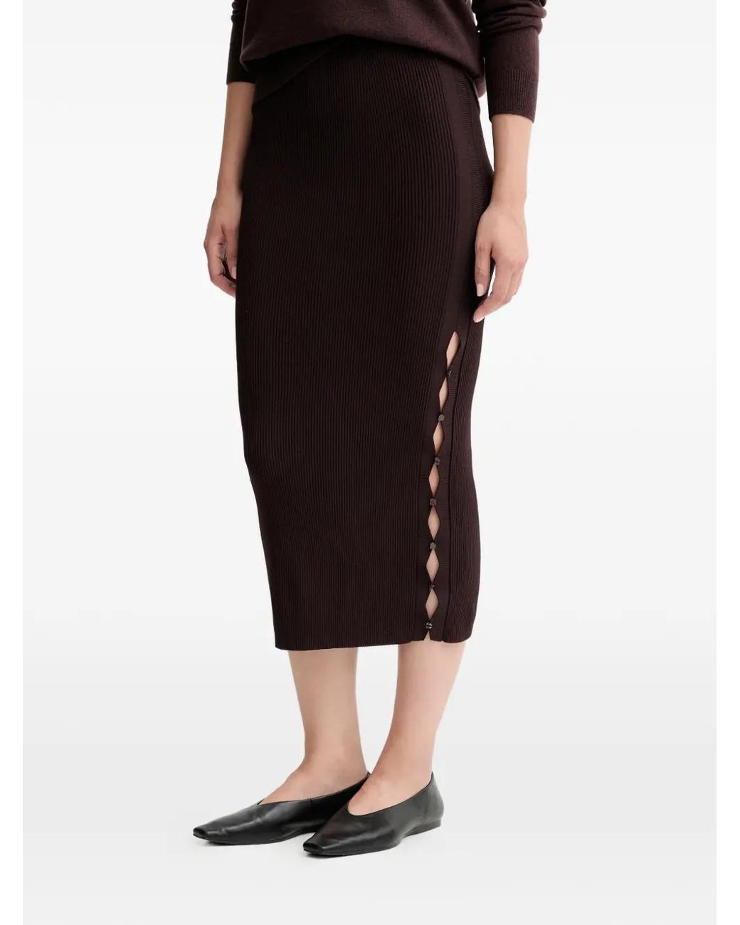 Dark brown ribbed knit side button detail pencil design Size: XS. Gender: Female. Material:Fabric. Color: black
