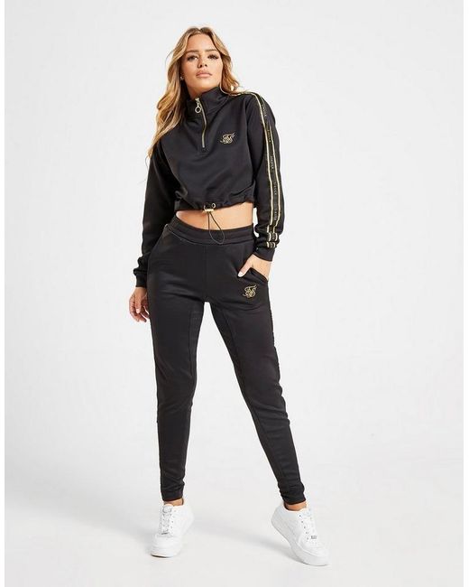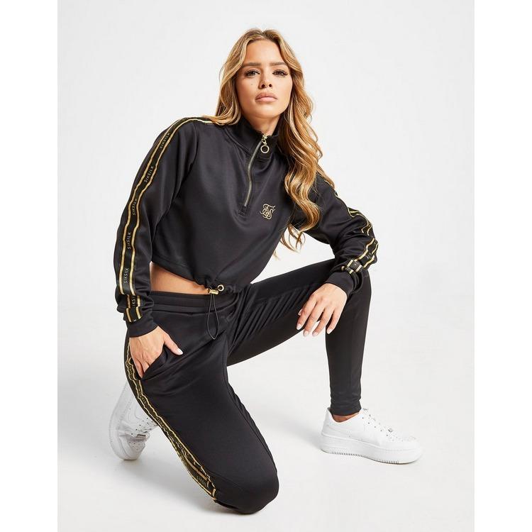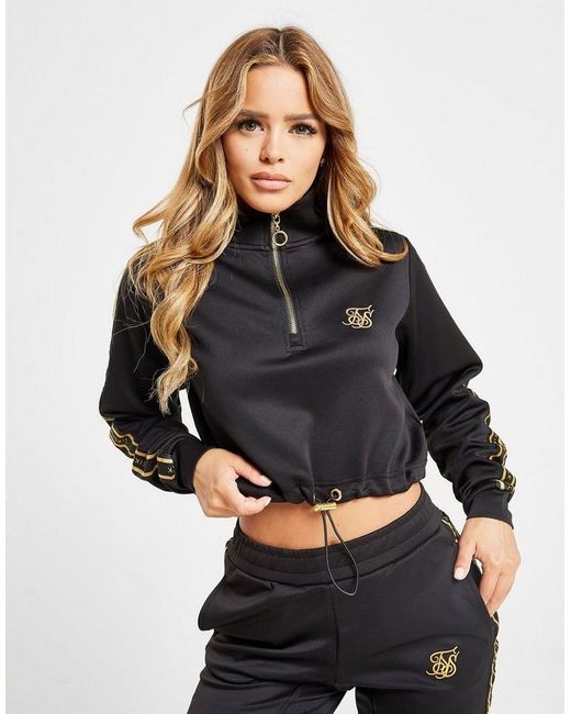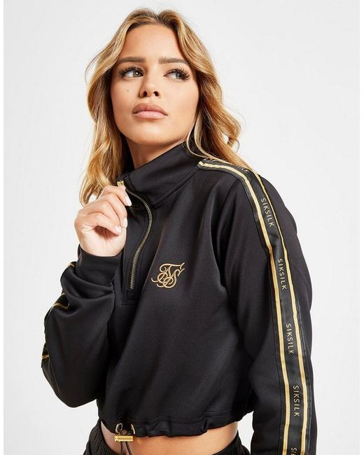 Rep a premium look with this women's Poly 1/2 Zip Track Top from SikSilk. Exclusive to JD, this regular-fit layer is made from smooth poly fabric with added stretch to boost comf. It has a cropped hem with an adjustable draw cord to switch up the look, as well as a half zip fastening for custom coverage. With long sleeves that rep branded SikSilk taping, this track top is finished with luxe gold-tone detailing and the signature SikSilk logo embroidered to the chest. Rep with sweatpants or leggings for a laid back look. Machine washable. Our model is 5'4" and wears a size 8. Material: 95% Polyester/5% Elastane. Color: black