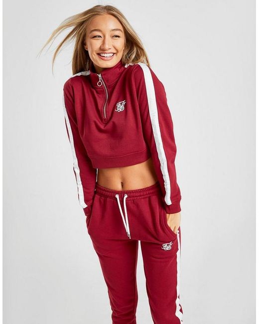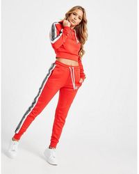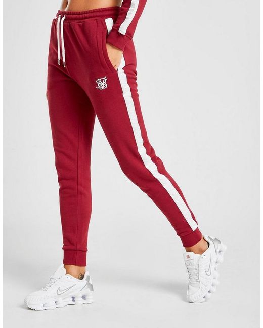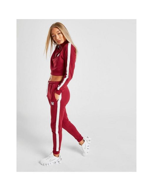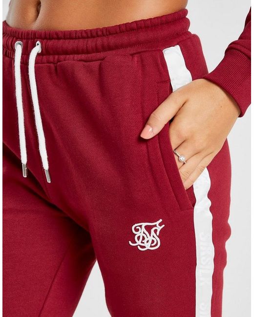 Exclusive to JD, these women's Tape Sweatpants from SikSilk have off-duty comfort covered. In a berry colourway, these pants are made from super soft jersey fabric. They feature slightly tapered legs, elasticated cuffs and a stretchy waistband with an adjustable draw cord for a comfy, custom feel. With two side pockets for a laidback vibe, these pants are finished up with contrasting SikSilk taping to the sides and the iconic logo embroidered to the thigh. Wear them with the matching track top for a full, JD-exclusive 'fit. Our model is 5'8" and wears a size 8. Material: 50% Cotton/50% Polyester. Color: red