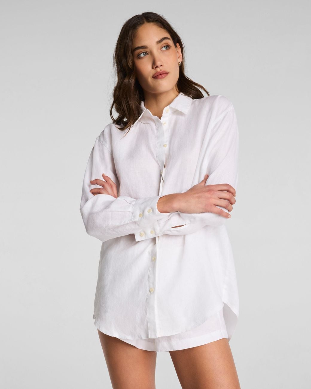 Elevate your beach style with ease. Our SPANX® Beach Button Down is crafted from 100% premium linen with quick-drying fabric that transitions seamlessly from beach to boardwalk. Featuring a relaxed fit, this versatile lightweight shirt is perfect for beach days, poolside lounging, or any warm-weather escape. Pair with your favorite SPANX® Swim styles for a flattering, fun-in-the-sun look. | Spanx Women's Beach Button Down in Vivid White Color: white