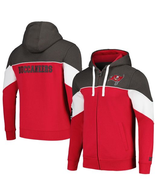 When cooler weather arrives, be prepared with this Tampa Bay Buccaneers Running Back full-zip hoodie from Starter. The spectacular Tampa Bay Buccaneers graphics will leave no doubt in anyone's mind that you're a fiercely loyal fan. The comfortable fabric construction as well as spacious pockets and hood will ensure you stay nice and cozy wherever you go. Cotton, Polyester. Color: red