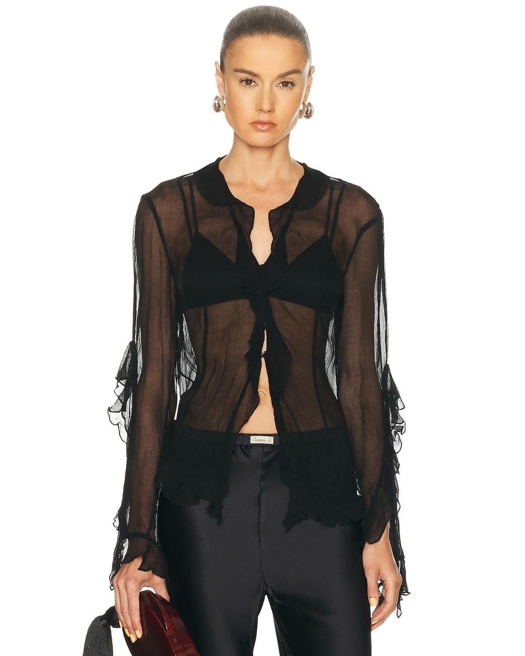 Staud Kellcy Top in Black 100% viscose. Made in China. Dry clean only. Front button closure. Adjustable button cuffs. Lightweight crepe fabric. Garment is intentionally sheer, undergarments will show through. Please note undergarment not included. STAD-WS130. R26S1169CF. About the designer: After an impressive stint as a fashion stylist and director, Sarah Staudinger took a stab at venturing solo with her namesake brand STUAD. Co-founded with partner, George Augusto in 2015, this LA-cool girl collection of dresses, handbags and footwear insists upon the notion that fashion shouldn’t just empower women — it should be accessible, too.At heart of STAUD is design, think: scrupulous attention to detail, a natural opposition tothe typical, and a feminine aura that’s equal parts seductive and self-governing with the principle belief that fashion is a never-ending pursuit of style. Color: black