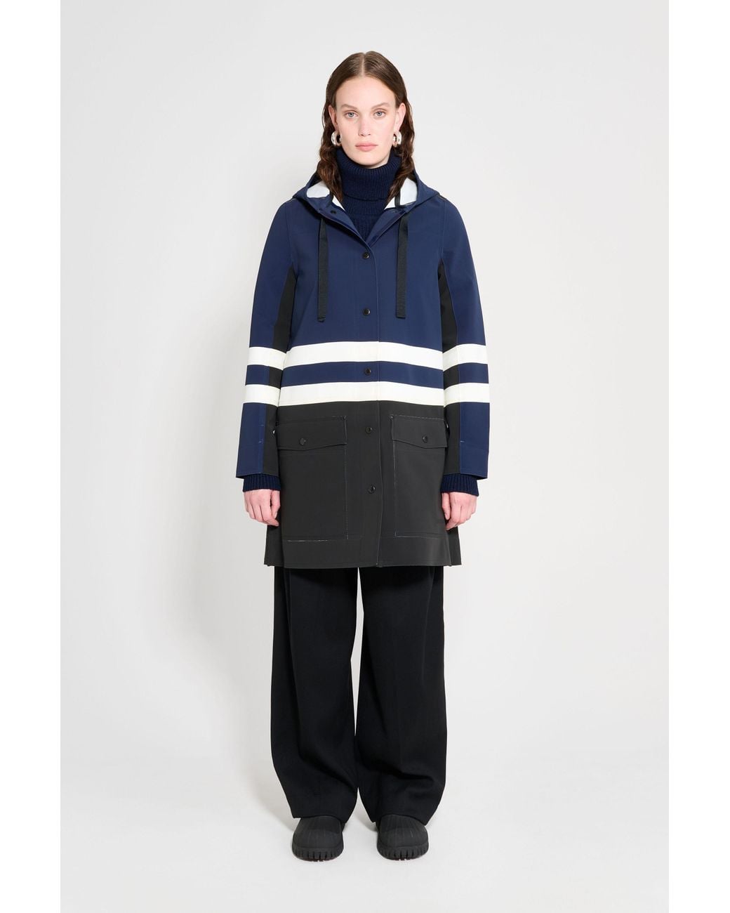 Blackeberg is an artisanally made a-line-shaped raincoat for women. The waterproof fabric has a matte-textured finish and is tailored with triple-welded seams, making it impossible for any moisture to seep through. Ease of movement and comfort are achieved with under-arm eyelets and a drawstring hood, while the two-tone design and colour-block stripes make this a true statement style, defying bad weather in the name of fashion. Color: blue