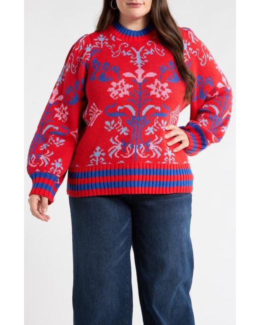 An ornate pattern and crisp stripes at the hems add plenty of festive style to this endlessly cozy sweater. Color: red