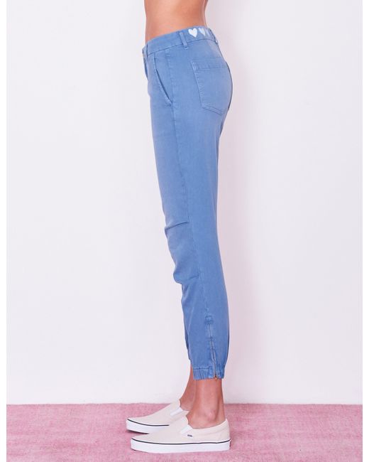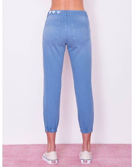 SKU: PS19-N8A-E59A38. An easy, relaxed fit constructed with attention at the knees and finished with an elastic bottom hem. Featuring 3 hearts printed on the waistband, zipper details at leg opening and functioning pockets. With just the right amount of stretch to move with your body, these pants were meant to go from work to play. 98% Cotton, 2% Spandex. Wash Cold. Made in USA. Sydney is 5'9" and wearing a size 26. Returns & Exchanges. Color: blue