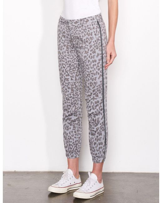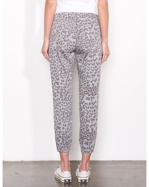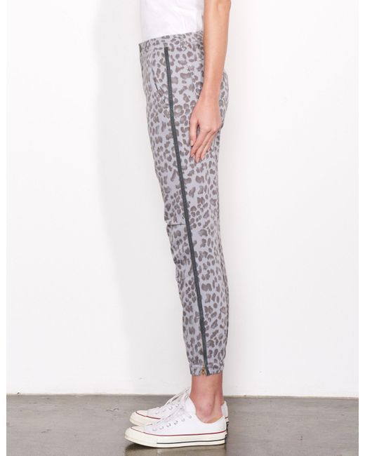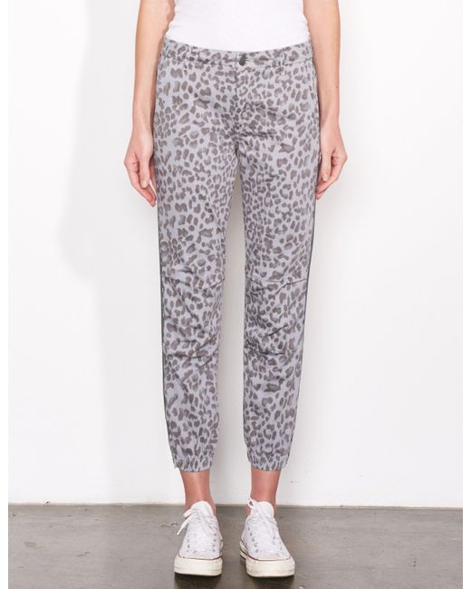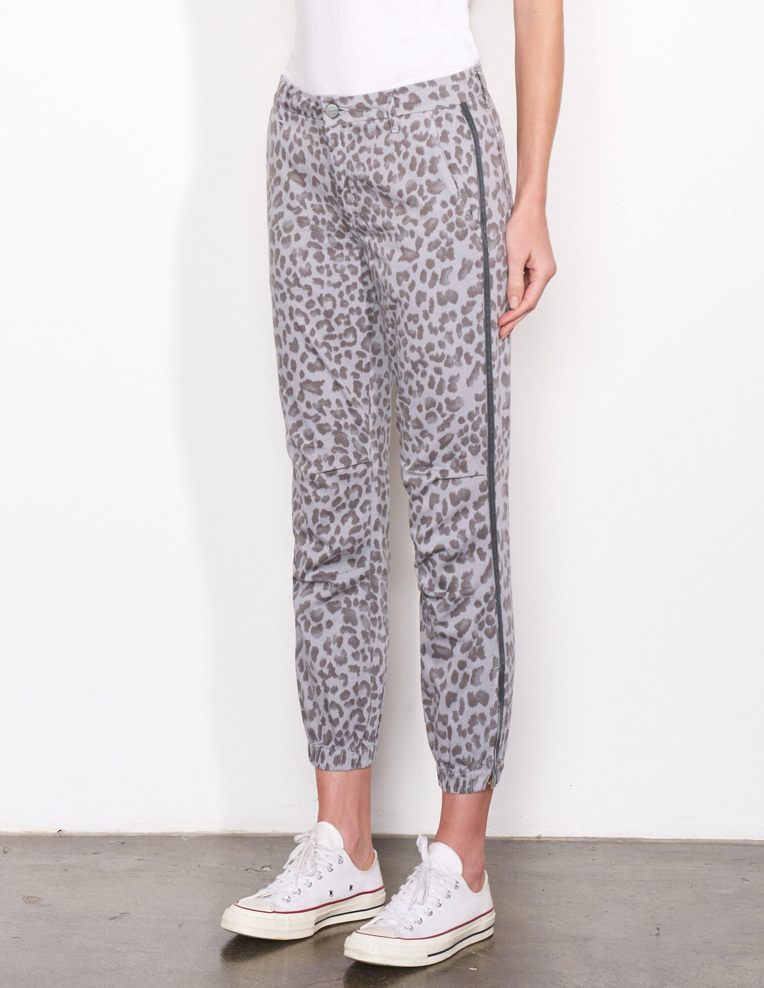 SKU: F19-N8D-E59T37. An easy, relaxed fit constructed with attention at the knees and finished with an elastic bottom hem. Featuring a woven side tape, all-over leopard print, zipper details at leg opening and functioning pockets. With just the right amount of stretch to move with your body, these pants were meant to go from work to play. 100% Cotton. Wash cold. Made in USA. Sydney is 5'9'' and wearing a size 26. 38" Low Hip. 9.75" Front Rise. Returns & Exchanges. Color: gray