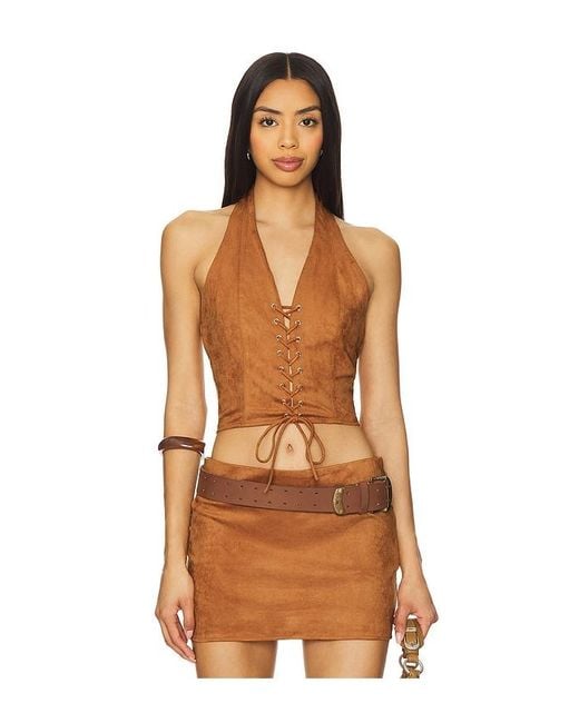 Superdown Delphi Top in Tan. - size L (also in XXS, XS, S, M, XL) superdown Delphi Top in Tan. - size L (also in XXS, XS, S, M, XL) Self: 92% polyester 8% elastane Lining: 95% polyester 5% elastane. Machine wash. Front lace up design. Halter design. Faux suede fabric. Item not sold as a set. SPDW-WS2132. SDS2965 S25. superdown is a contemporary label offering on-demand, on-trend, on-social apparel. Always on the pulse of the latest styles, superdown is the go-to for aspiring, trendy, fashion-loving babes who are #superdown for anything. Color: orange