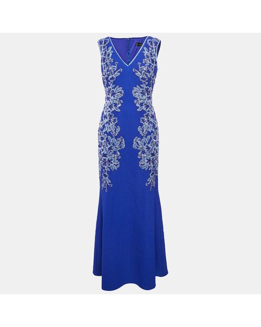 Women's Blue Floral Embroidery Textured Crepe Sleeveless Gown