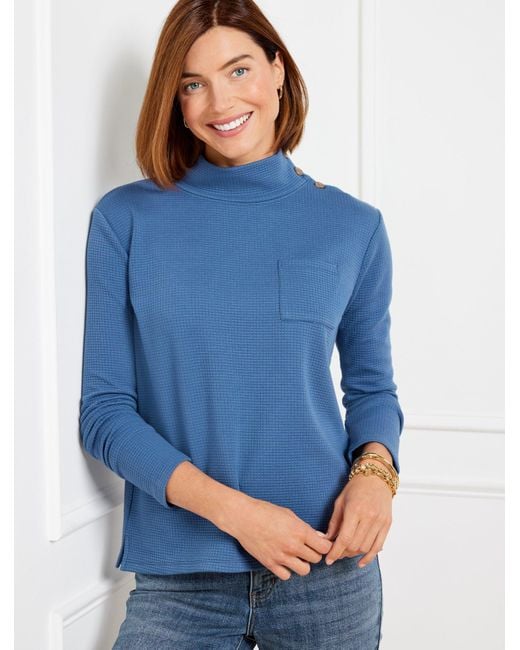 A modern take on our must-have mockneck pullover. Elevated with sleek buttons at the shoulder and a patch chest pocket. Features side slits at the hem. This style seamlessly travels from work to weekend. Polyester/Cotton. Color: blue