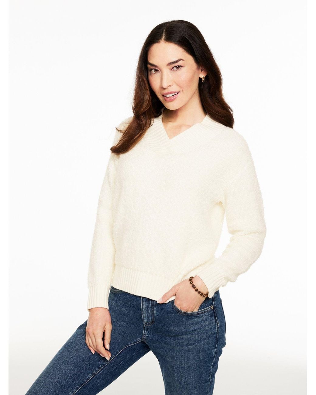 The sweater of the season in an eye-catching loop stitch. Crafted with a cozy cotton blend. Dress it up or dress it down. Cotton/Polyester/Acrylic. Color: white