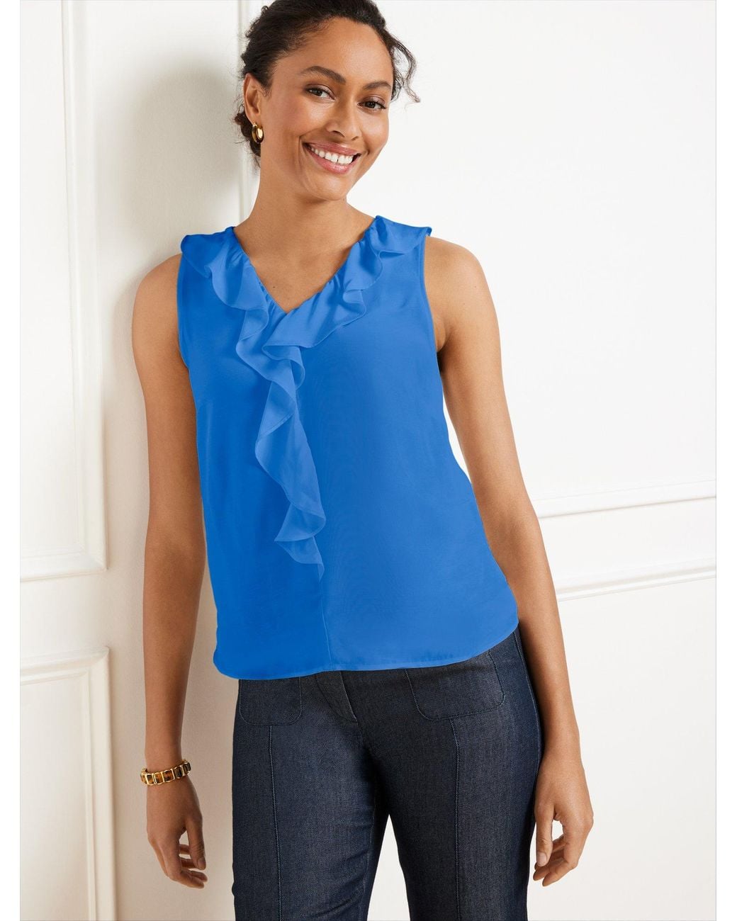 Pretty ruffles elevate our versatile shell. Sleeveless silhouette features a flattering V-neck. Color: blue