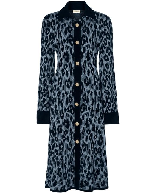 Black/blue wool patterned jacquard leopard print polo collar long sleeves turn-up cuffs straight hem Size: S. Gender: Female. Material:Viscose/Wool/Nylon. Color: blue