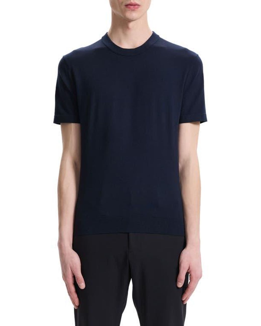 This sophisticated crewneck sweater is the perfect transitional layering piece with soft ribbing and abbreviated sleeves. 26 1/2" length (size Medium) Crewneck Short sleeves Ribbed cuffs and hem 59% viscose, 36% polyurethane, 5% other fibers Machine wash, dry flat Imported Color: blue