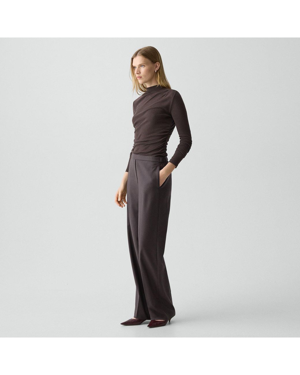 Designed with a creased front and elastic waistband, this pull-on pant combines clean tailoring with a wide-leg silhouette. It features slip pockets and a back welt pocket. It's crafted from fine Italian wool flannel that's soft, lightweight and has a sophisticated look. This wool is traceable to the certified responsibly managed Malahide farm in Tasmania, Australia, and is consciously woven by the Botto Giuseppe mill in Biella, Italy. Color: black