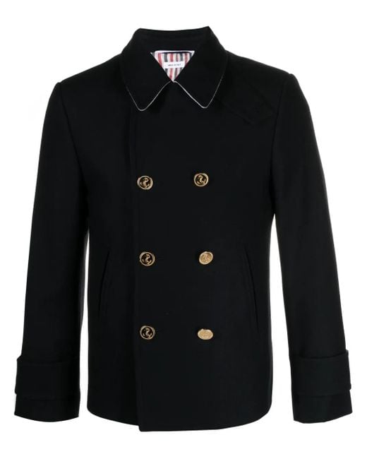 Navy blue virgin wool signature grosgrain loop tab gold-tone buttons contrasting under collar notched collar throat latch double-breasted button fastening long sleeves buttoned cuffs two side slit pockets RWB stripe lining internal logo patches internal jetted pockets American rear vent straight hem Size: 3. Gender: Male. Material:Virgin Wool/Cupro. Color: black