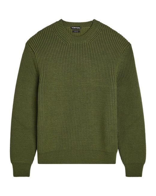 Men's Green Ribbed Crew-Neck Wool Sweater