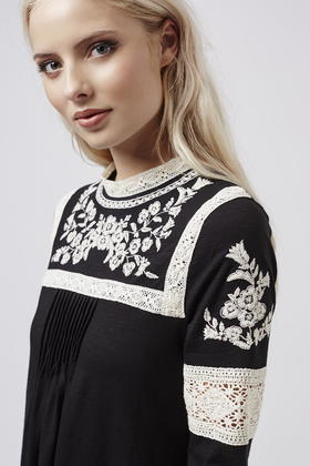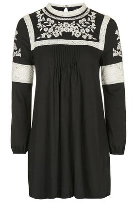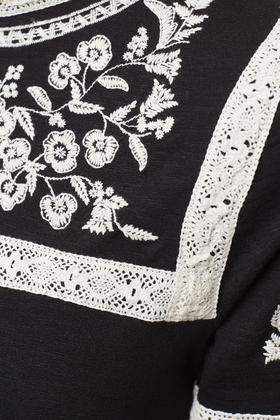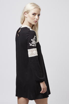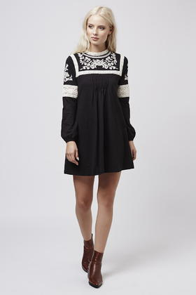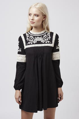 Go to TOPSHOPMake a classic monochrome palette work for now with bohemian inspired details. This easy-to-wear smock dress features beautiful embroidered details for a total boho look, complete with a high neck and keyhole button back fastening. Brave it with bare legs and ankle boots, adding layers or tights when temperatures are cooler. 100% Cotton. Color: black