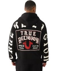 Go to MainlineTrue Religion X Playboy Full Zip Hoodie In Jet Black. A full front branded zip fastening with a large drawstring hood featuring metal tips. Ribbed designs to the cuffs on the long sleeves