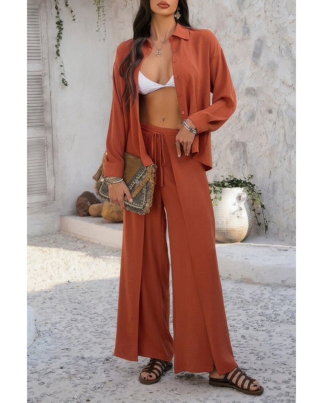 Women's Brown Two Pieces Split Solid Button Down Sets