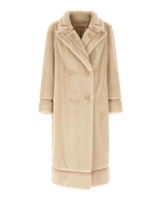 Double-breasted coat in fur-effect fabric with patterned inserts on the profiles, front button closure, oval t logo plaque on the back, lapel collar, pockets, long sleeves, lining. Color: natural