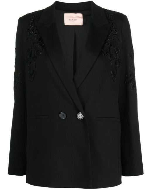 Women's Black Floral-Embroidered Double-Breasted Blazer