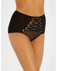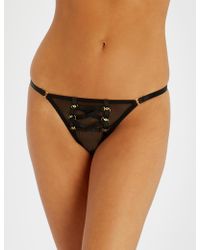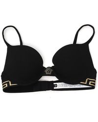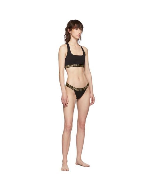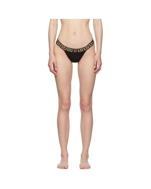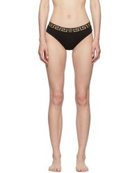 Stretch cotton jersey thong in black. Signature Greek key pattern and logo text in gold-tone at elasticized waistband. Color: black