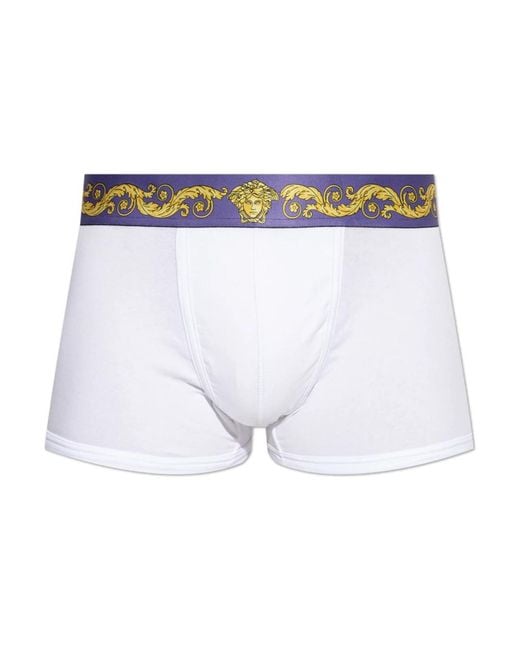 Versace Printed Cotton-Jersey Trunks blend Italian craftsmanship with a tailored cut and a decorative waistband for refined everyday comfort. Key attributes: White | Cotton | Stretch fabric | Soft handfeel | Smooth finish | Elastic waistband | Tailored cut | Contrast waistband with gold emblem | Botanical ornament detail on waistband | Solid body | Dimensions & fit: Model height: 185 cm | Chest: 92 cm | Waist: 74 cm | Hips: 91 cm | Close-fitting | Model is wearing size 5 | Composition & care: Outer: 94% Cotton, 6% Elastane | Gusset: 94% Cotton, 6% Elastane | Trim: 90% Polyester, 10% Elastane Color: white