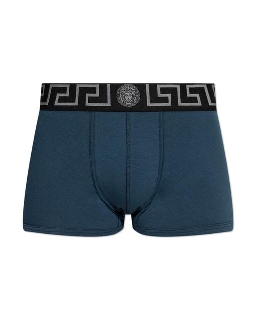 Versace Greca Border Trunks combine soft cotton-jersey comfort with the label's signature Greca waistband and Medusa emblem for a refined everyday trunk. Key attributes: Blue | Navy blue | Cotton | Breathable fabric | Soft handfeel | Stretch for ease of movement | Elastic waistband | Gusset for support | Greca border waistband | Medusa head emblem | Solid color | Classic trunk silhouette | Precise stitching | Dimensions & fit: Model height: 185 cm | Chest: 92 cm | Waist: 74 cm | Hips: 91 cm | Model is wearing size: 5 | Length: 23 cm / 9.1" | Slim fit | Low rise | Fits true to size | Composition & care: Outer: 94% cotton, 6% elastane | Gusset: 94% cotton, 6% elastane | Trim: 81% polyester, 17% elastane, 2% nylon | Follow garment care label; for hygiene, try on with personal underwear and consult the manufacturer's care guide. Color: blue