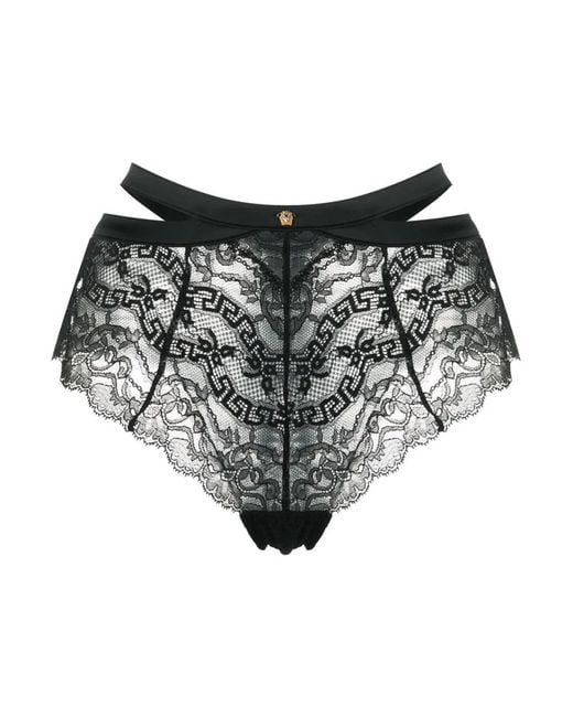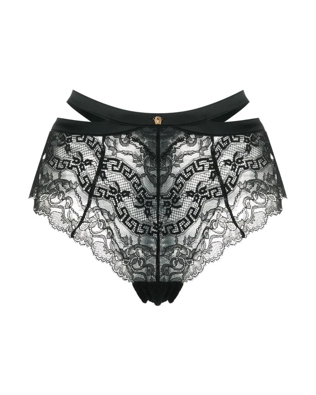 Elevate your lingerie collection with these luxurious black satin underwear bottoms from Versace. Featuring satin profiles and an iconic metal Medusa detail, these unlined bottoms are made in Italy from 100% polyester. Color: black