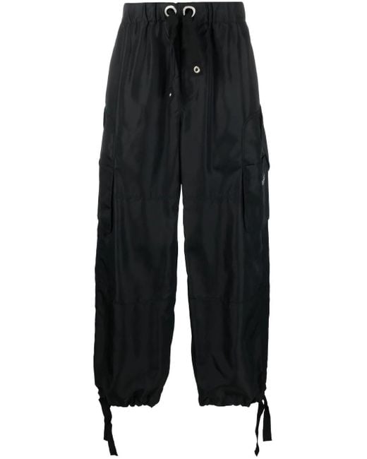 Black logo print to the front tonal stitching elasticated drawstring waistband zip fly fastening two side inset pockets multiple cargo pockets two rear welt pockets wide leg drawstring cuffs Size: 48. Gender: Male. Material:Cotton/Cotton/Polyamide/Viscose/Polyester. Color: black