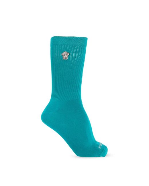 Experience the luxury of Versace with these Embroidered Medusa Ribbed Socks, designed for everyday elegance. Crafted from high-quality cotton, they offer both comfort and style with a signature Medusa embroidery and subtle logo. Key attributes: Blue | Cotton | Breathable fabric | Ribbed-knit | Medusa embroidery | Logo motif | Dimensions & fit: Anatomical fit | Composition & care: 80% Cotton | 20% Other fibers | Machine wash cold, tumble dry low Color: blue