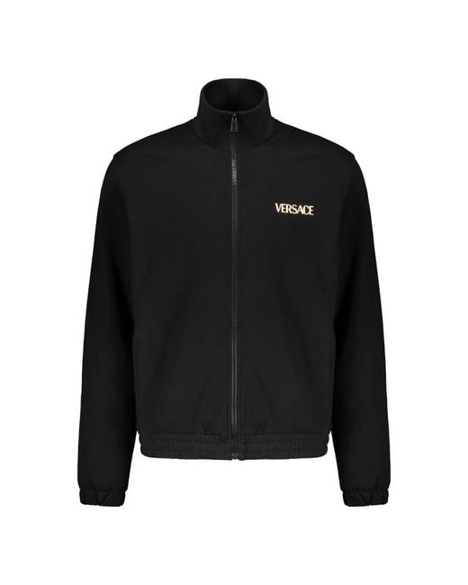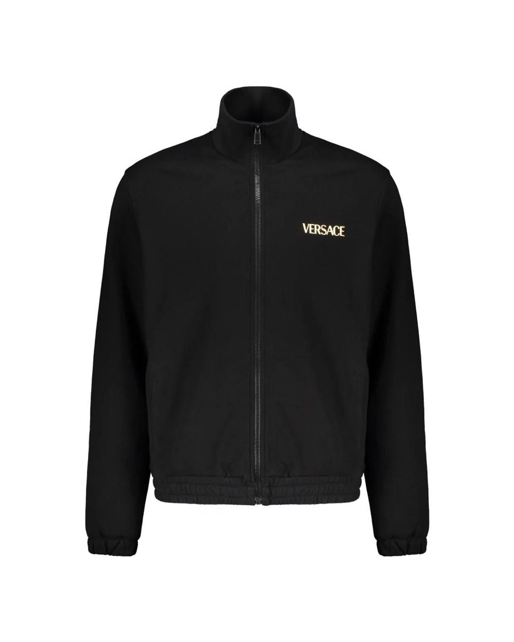 Elevate your casual style with this Versace sweatshirt for men. Featuring a front logo print, back gold-tone metallic effect maxi logo print, elasticated cuffs and hemline, stand up collar, and two front pockets. Made of 100% cotton.