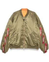 Go to ESSX NYCVetements Cargo Bomber Green reversible oversized padded jacket features a ribbed stand collar, dropped shoulders, multiple utility pockets along sleeves, multiple contrasting logo ribbon pocket pulls, interior buttoned pockets, two-way zip front fastening, two