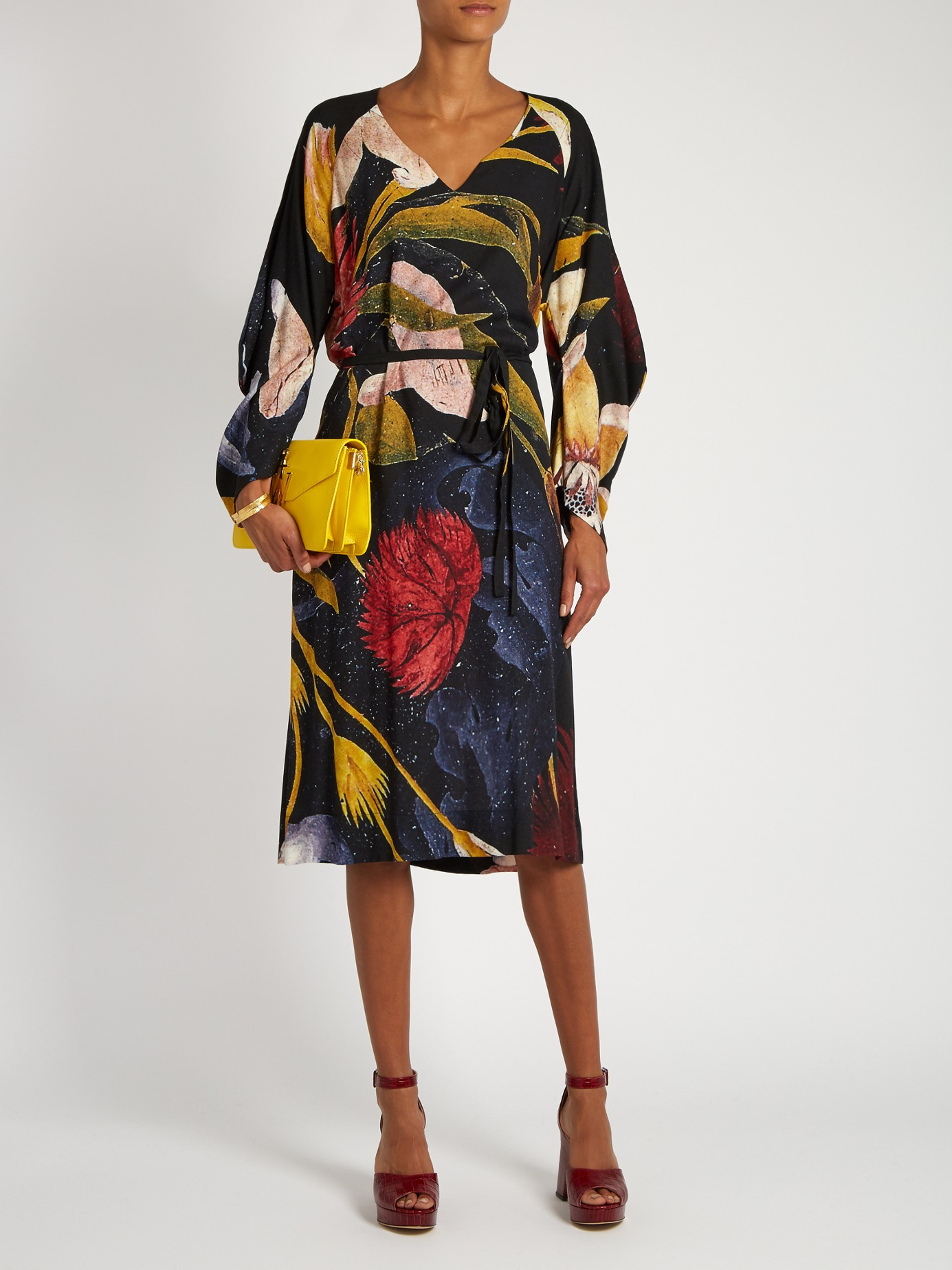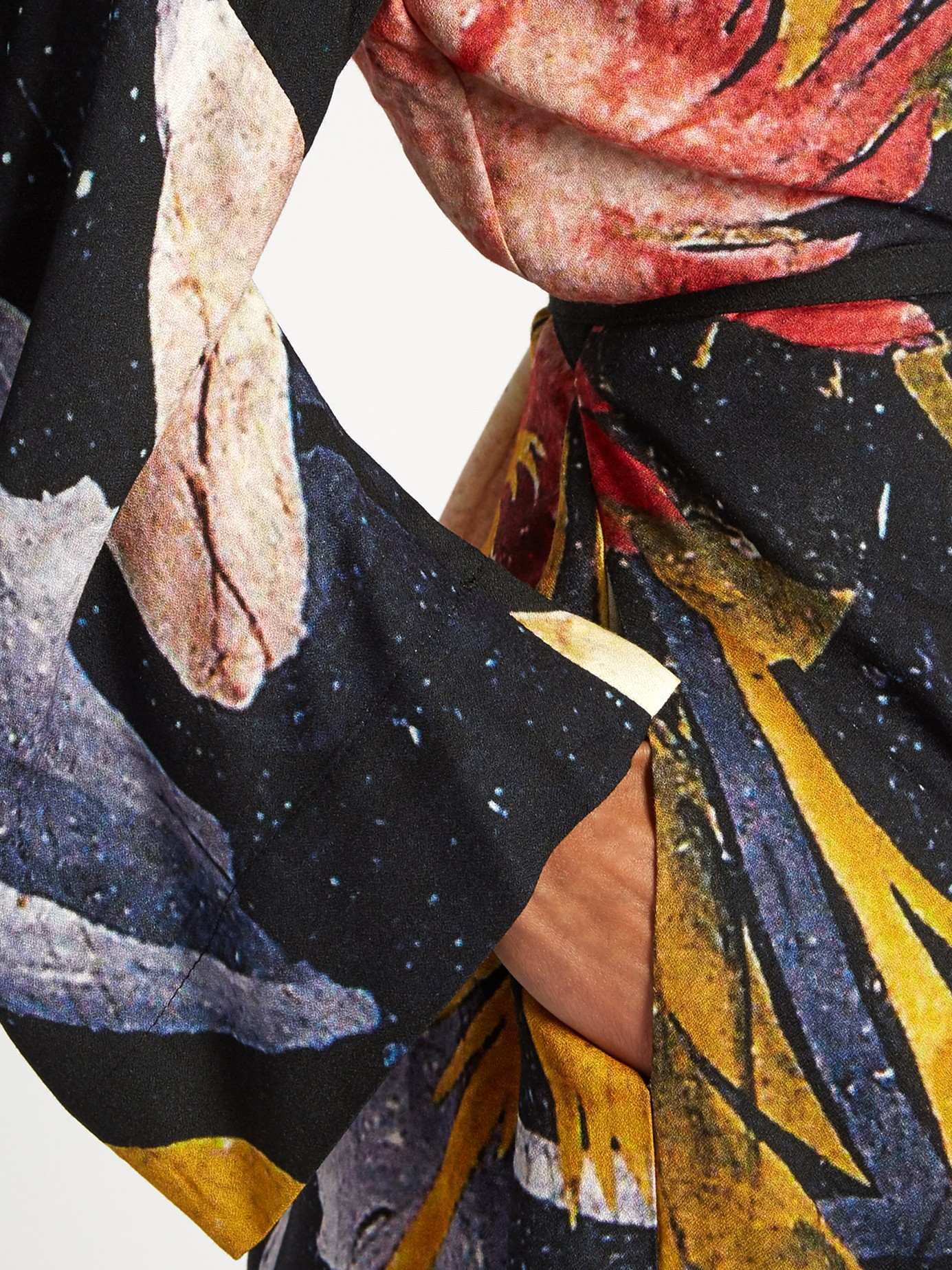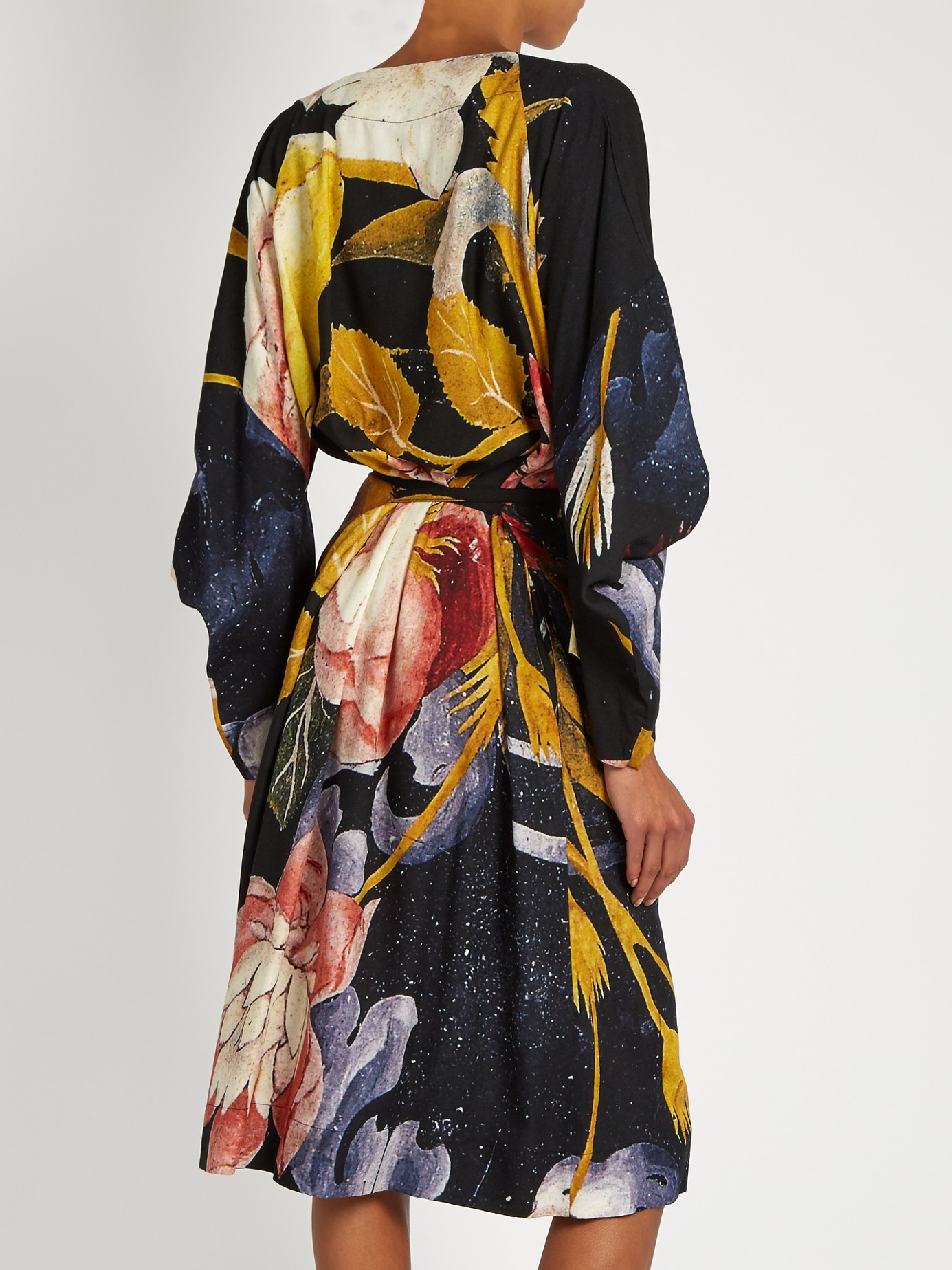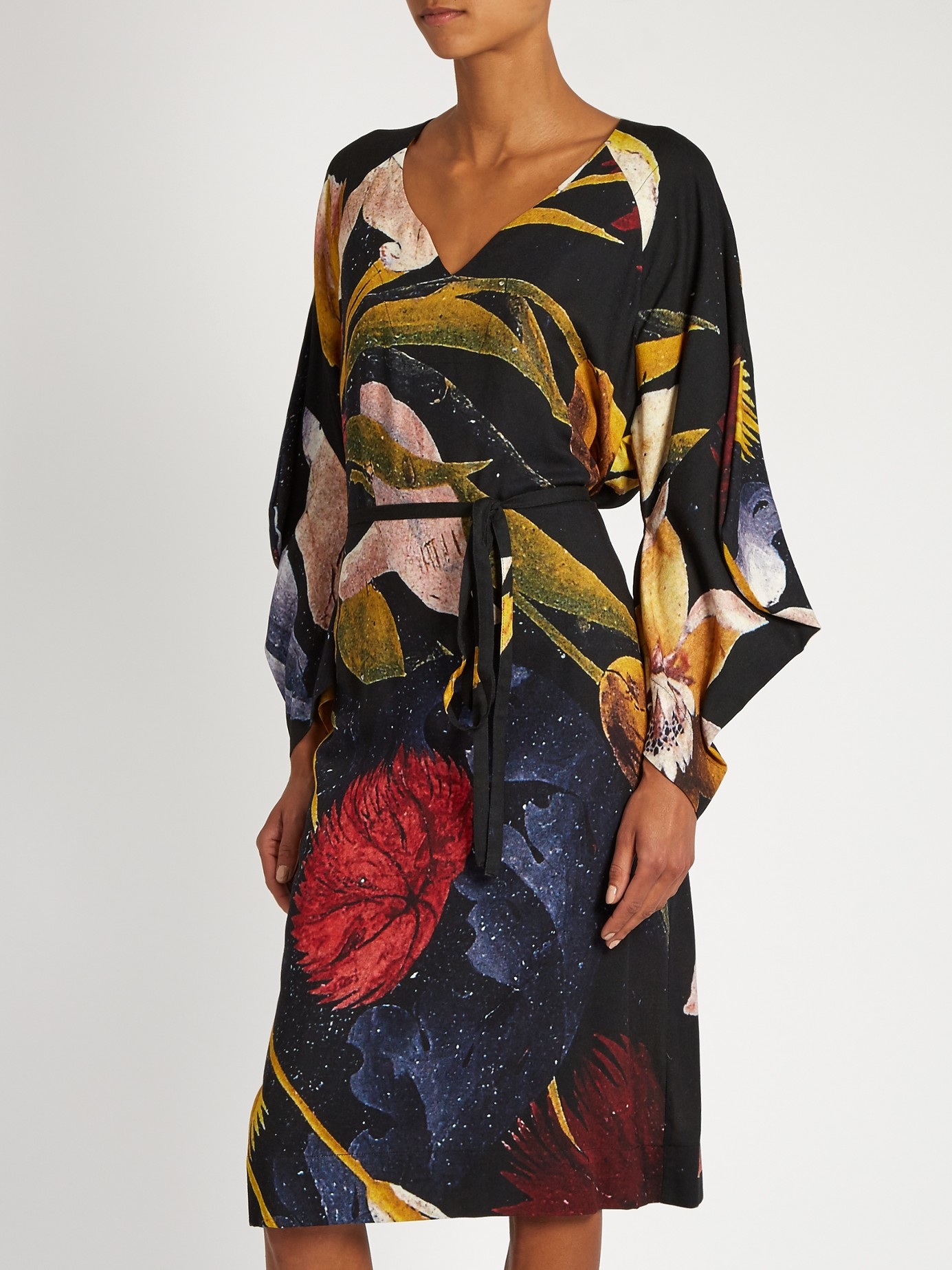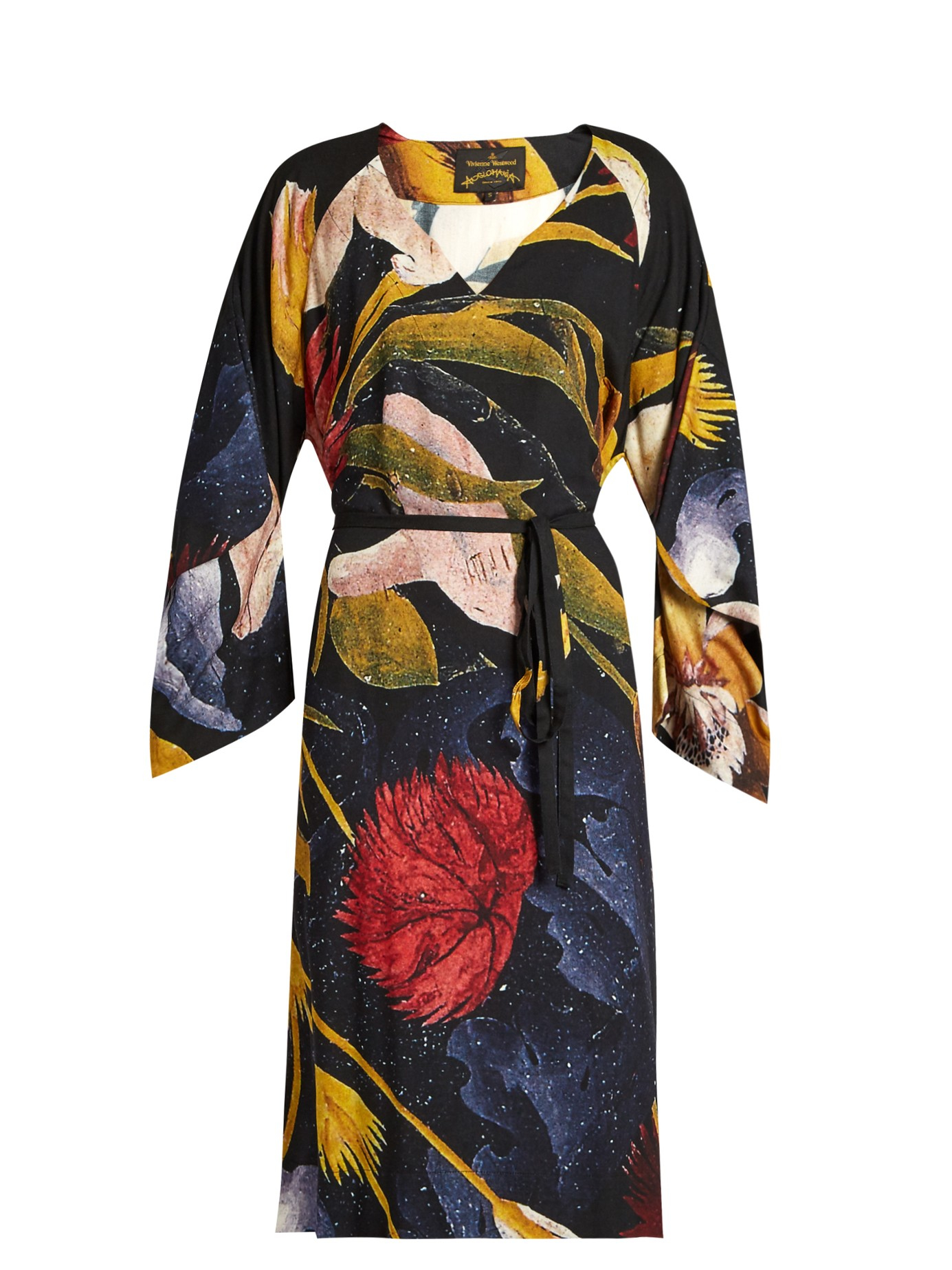 Go to MATCHESFASHION.COMThis black crepe Anglomania dress is an homage to Vivienne Westwood's revolutionary AW83 Witches collection. It's cut using the same technique as the original designs, with a V-neck front and long, pointed sleeves, and is printed with a supersized floral design inspired by 17th-century artistry. Belt the waist with the accompanying tie, and pick out the colors with coordinating accessories. Black and multicolured floral-print, crepe. V-neck, half-length wide sleeves. Matching black self-fastening waist-tie. Side-seam pockets. 85% viscose, 15% wool. Dry clean. Country of origin: Italy. Fits true to size. Drapes loose over the frame. Wear tie to cinch in the waist for a personalised fit. Those with a petite frame may wish to take a size smaller.