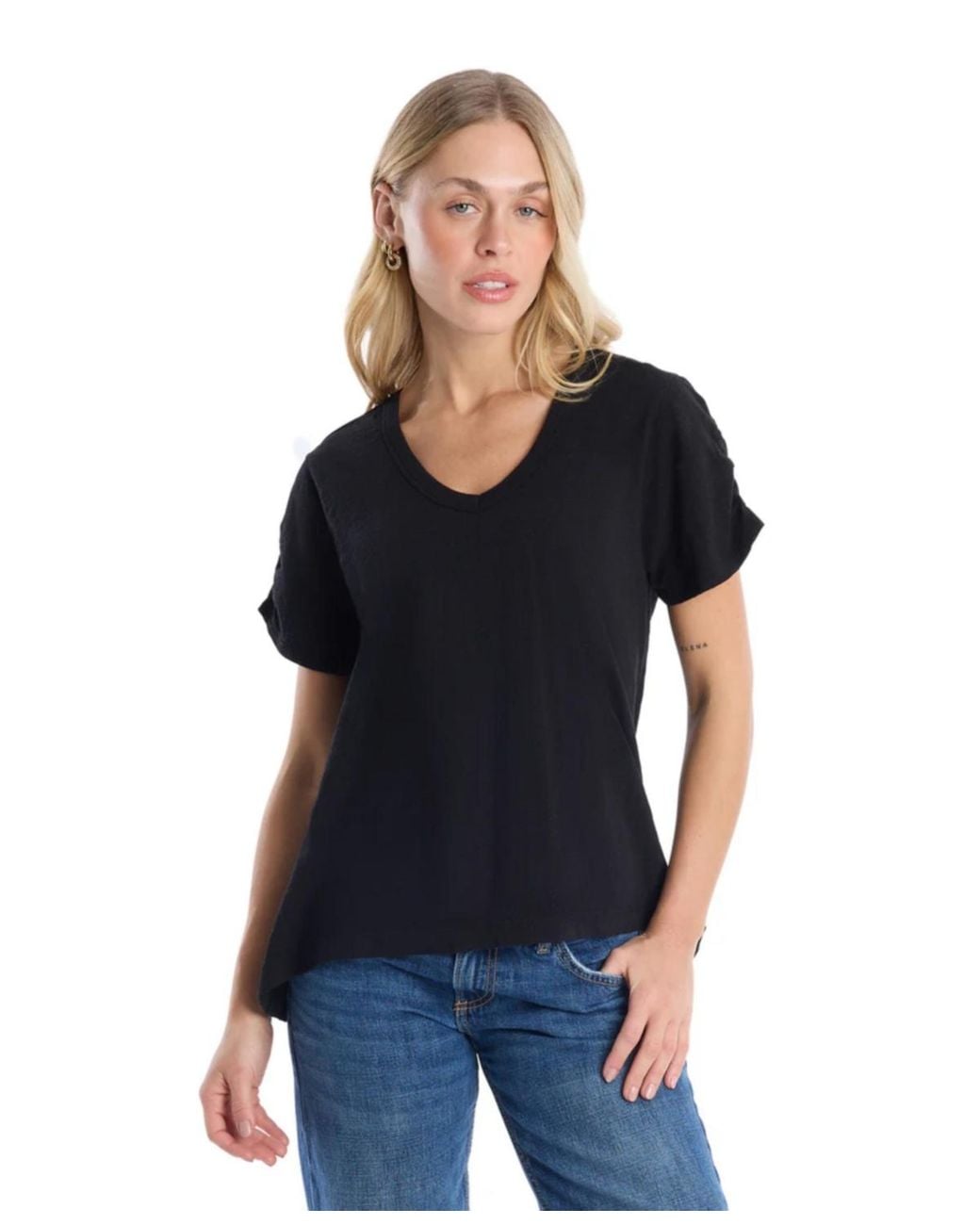 Deep V-Neck Ruched Short Sleeve Tee Designed to flatter, this deep V-neck tee is crafted from our signature slub jersey for a soft, lived-in feel. Subtle ruching enhances the silhouette, adding a feminine, body-skimming effect while keeping the look effortless and wearable. 100% Cotton. Color: blue