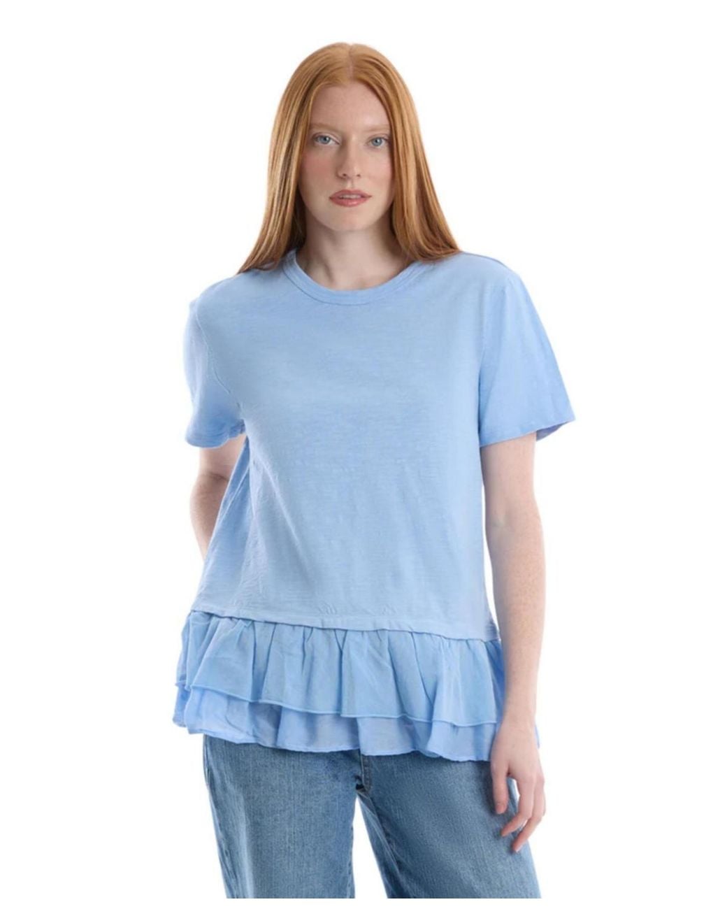 Round Neck Short Sleeve Mixed Media Tee with Peplum Hem An elevated everyday essential, this round neck tee is designed in our signature slub jersey for a soft, breathable feel. The mixed media peplum hem adds feminine dimension and movement, creating a flattering silhouette that transitions effortlessly from casual to polished. 100% Cotton. Color: blue