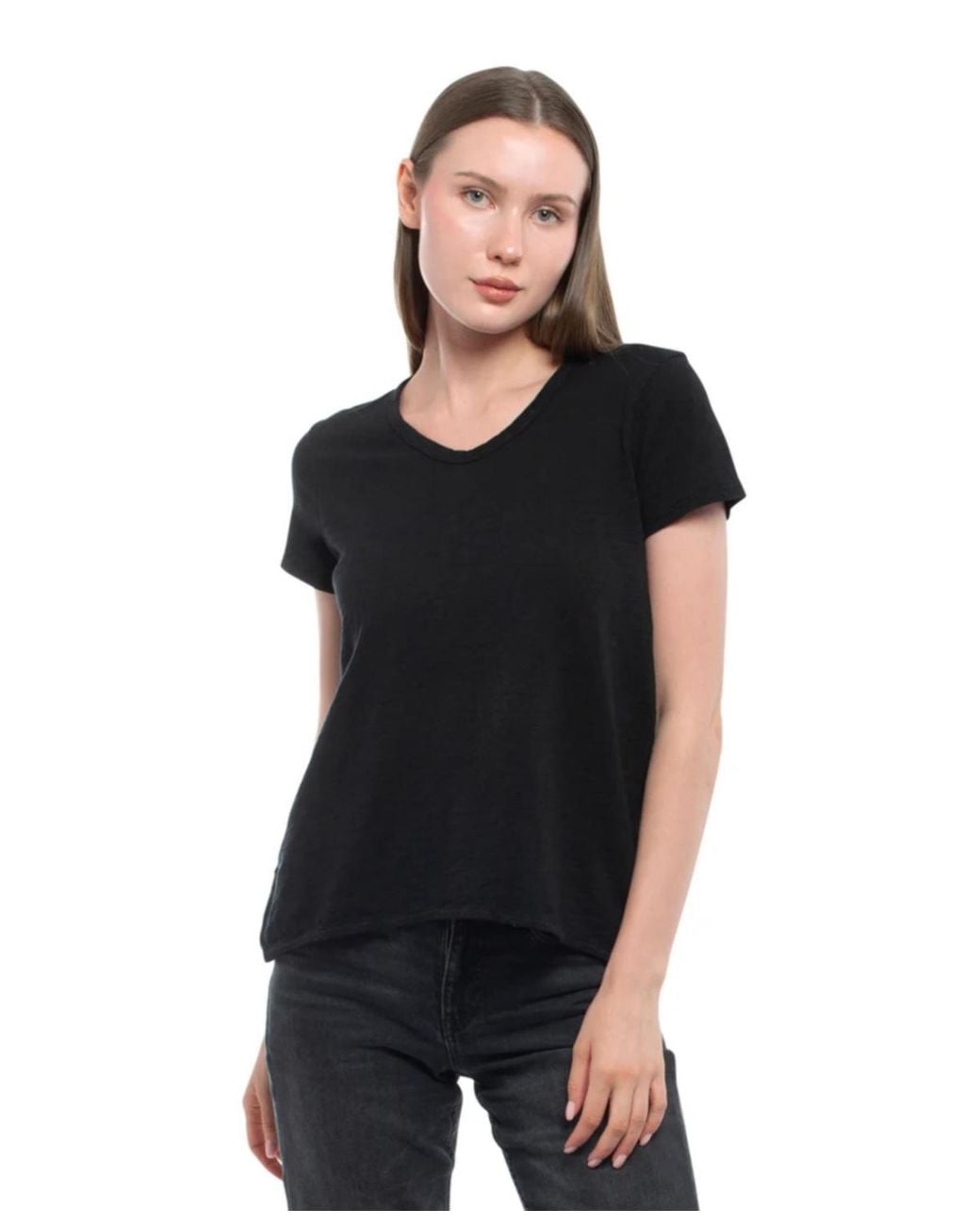 Crew Neck Short Sleeve Shrunken Boyfriend Tee A fresh take on the borrowed-from-the-boys classic. This shrunken boyfriend tee features a flattering, close-to-the-body fit with a timeless crew neckline. Made from our signature slub cotton for soft texture and effortless drape. 100% Foundation Slub Jersey. Color: black