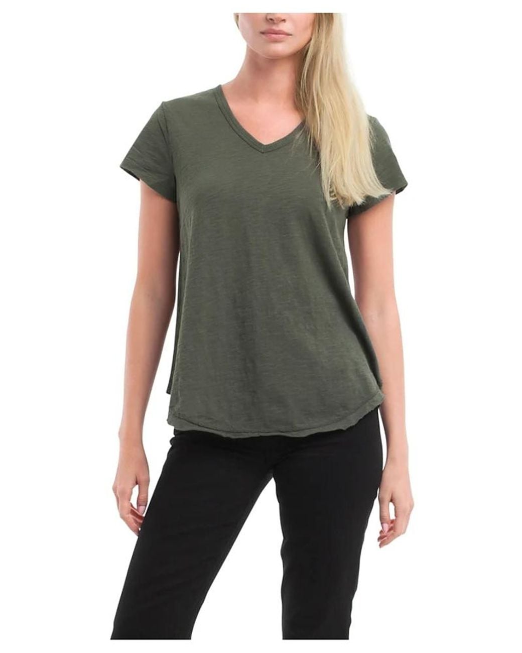 About The Brand:A modern update to a timeless classic. This shrunken-fit V-neck features a shirt-tail hem and raw edge detailing for a laid-back yet elevated vibe. Made in our signature slub fabrication, it s soft, lightweight, and designed to flatter. Perfect for everyday wear, this style is ideal when worn solo or layered. Color: black