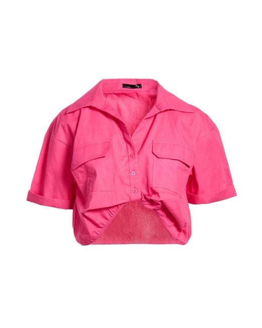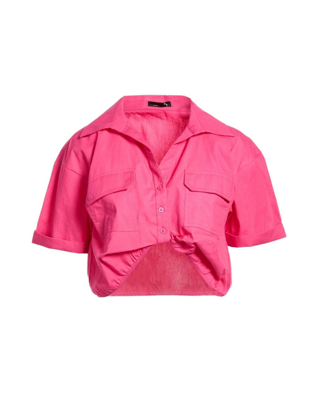 Shirt, poplin, solid color, no appliqués, camp collar, short sleeves, button fastenings, hand wash or dry clean, do not bleach, do not tumble dry , Color: Fuchsia , Size: XS