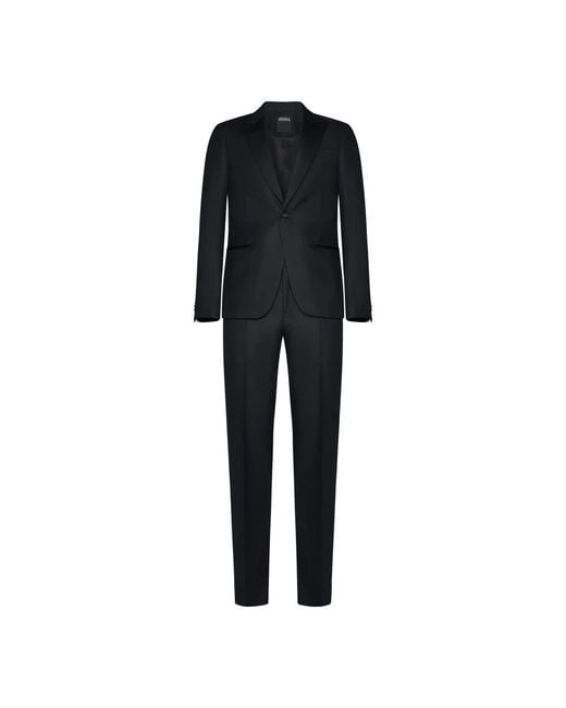 Zegna’s regular-fit suit in black wool. Single-breasted blazer featuring peak lapels, chest pocket, front welt pockets and back vents. Straight leg trousers featuring four pockets and ironed crease.