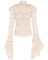 Go to ItalistZimmermann presents a hand-crocheted cotton sweater that epitomizes craftsmanship and artistry. The intricate pattern showcases a scalloped raised collar and a unique cape-like detail on the shoulders. Long sleeves feature dramatic asymmetrical oversized