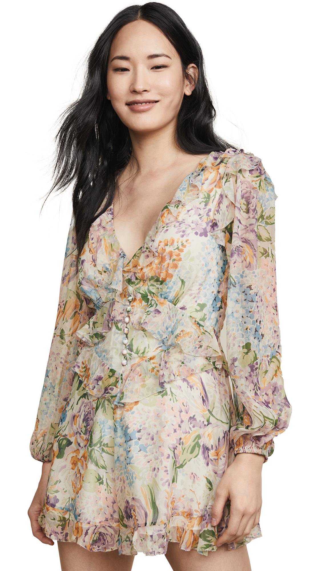 Zimmermann ninety six flutter playsuit in floral,neutral. Size 0 / xs (also in ) self: 100% silklining: 100% viscose. Made in china. Dry clean only. Button front accents. Hidden back zip closure. Back tie detail. Ruffled trim.