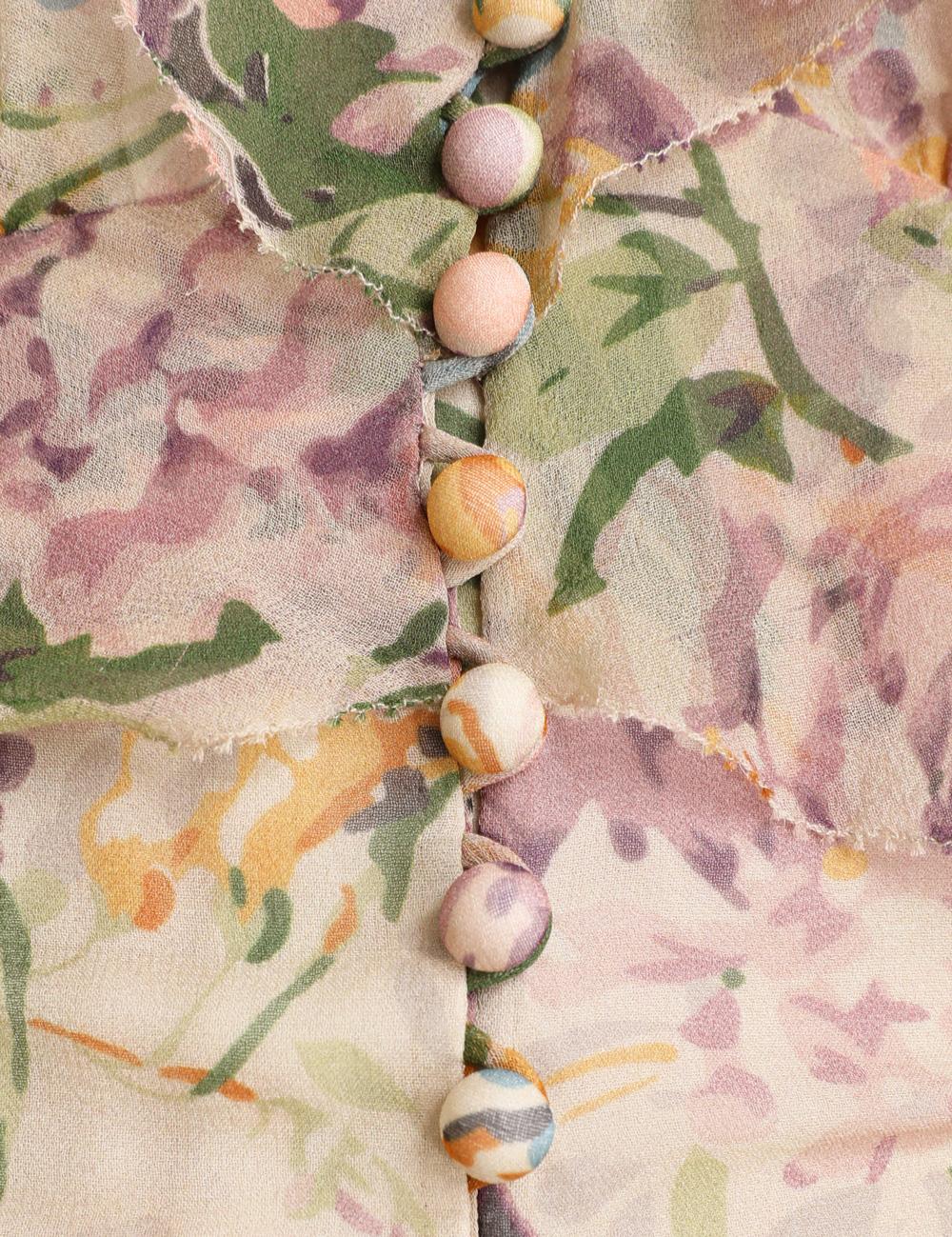 Fabric: Crepe. Ruffled detailing. Tie at neckline. Floral print. Button at front. Hidden zip at back. Shell: 100% silk. Lined. Lining: 100% viscose. Dry clean. Style #ZIMME41785. Inseam: 0.75in / 2cm.