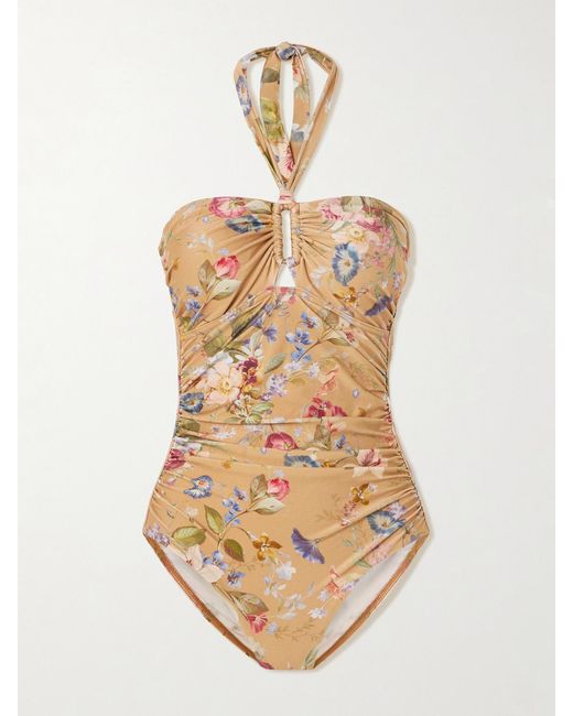 - Patience Ruched Floral-Print Halterneck Swimsuit