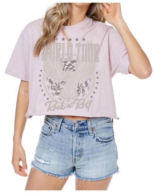 The perfect crop top for those warmer weather days.Embrace laid-back style with the World Tour Graphic Crop Top by Zutter in a chic rose hue. This women's crop top features short sleeves and a classic crewneck, designed with a striking "World Tour Rock n' Roll" eagle graphic for a touch of grunge flair. Crafted from 100% cotton, this piece offers a relaxed fit and soft feel, ideal for staying comfortable throughout your day. Closure - Pull On. Care - Machine wash. Perfect for summer streetwear o Color: blue