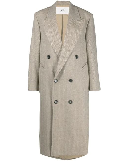 Mandelbeige, Elfenbeinfarben, Fischgrätenmuster, breites steigendes Revers, doppelreihiger Knopfverschluss, Schulterpolster, lange Ärmel, Knopfmanschetten, zwei Eingrifftaschen vorne, zentrierter Schlitz hinten, gerader Saum, Midilänge. This item may not be on sale in France, UK, Italy, Belgium and Switzerland.